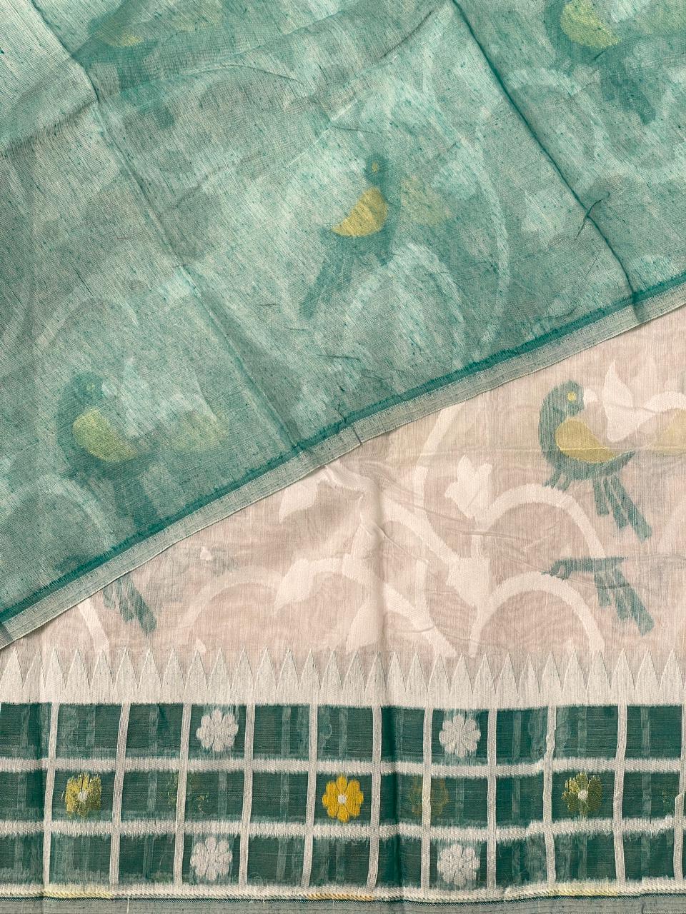 Cotton jamdani saree in white and peacock blue - PSCJ2