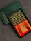 Bottle green semi Kanchipuram soft silk saree featuring all-over zari checks and buttas, complemented by a contrast rich border and elegant pallu. A perfect blend of vibrance and traditional charm