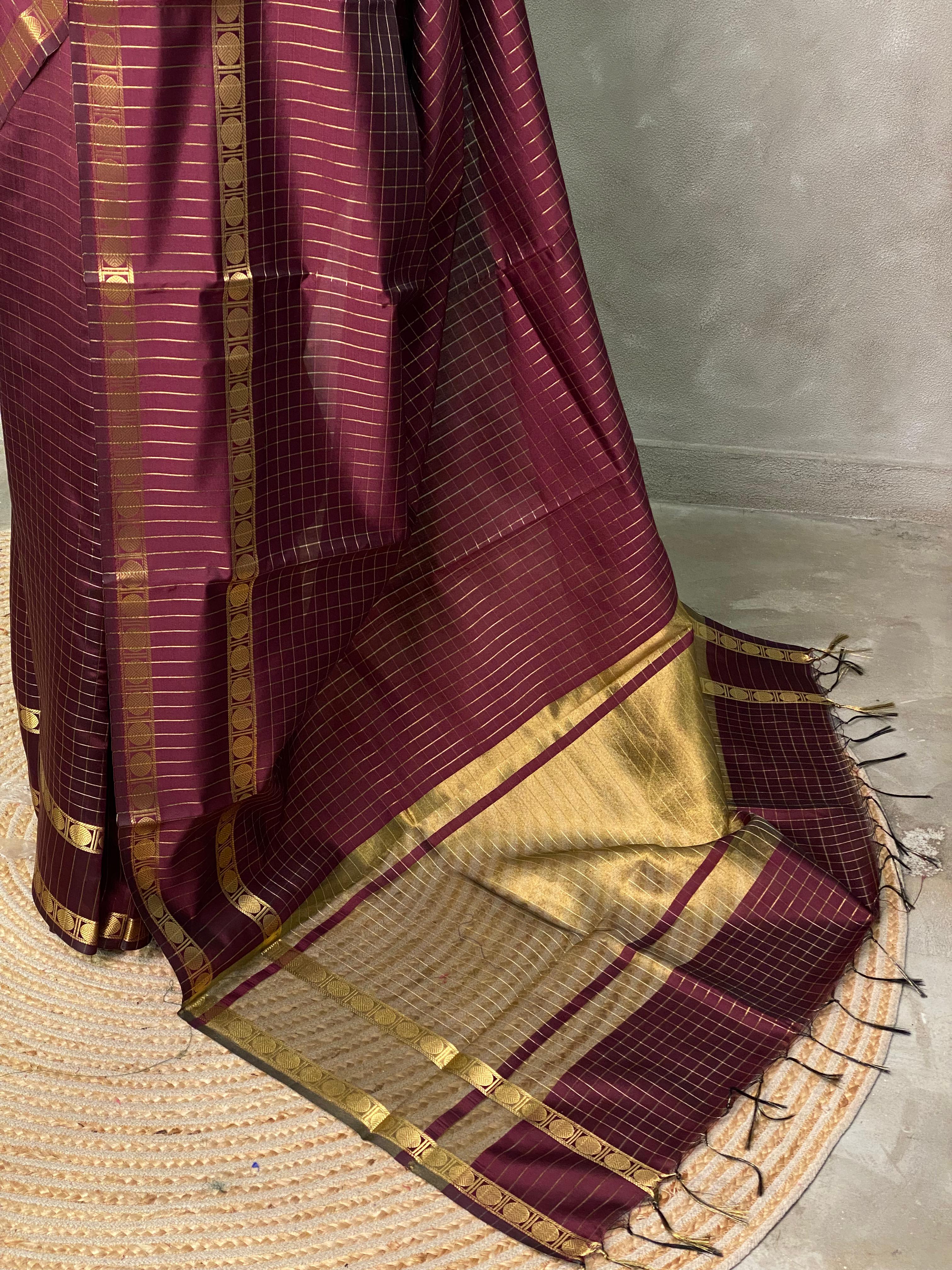This semi Banarasi saree features an elegant all-over check pattern enhanced with fine line zari weaving in a self color, giving it a subtle yet rich texture. The saree is beautifully finished with a Rattapett border woven with zari, adding a traditional and refined touch. Perfect for festive occasions and special gatherings, this saree reflects classic craftsmanship with understated elegance.