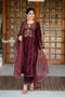 This deep pink velvet salwar suit features delicate embroidery on the neckline, sleeves, and sides. It comes with a matching dupatta adorned with embroidered edges, making it perfect for festive or traditional occasions.