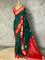 Dark green silk saree with red contrast blouse and pallu, adorned with all over motifs, traditional kanchi border and grand pallu. A rich and graceful choice for valakapp, wedding functions, and festive celebrations.
