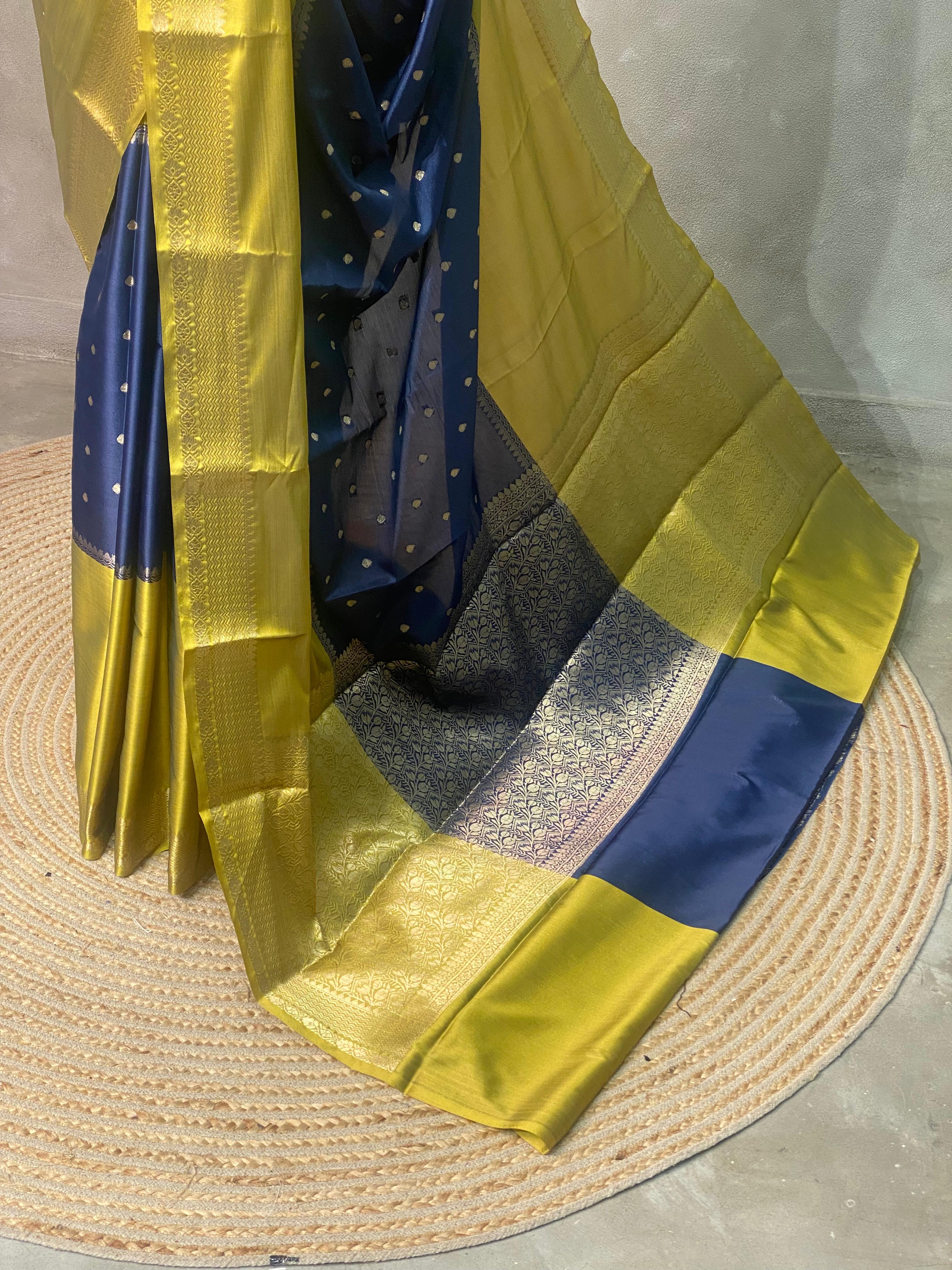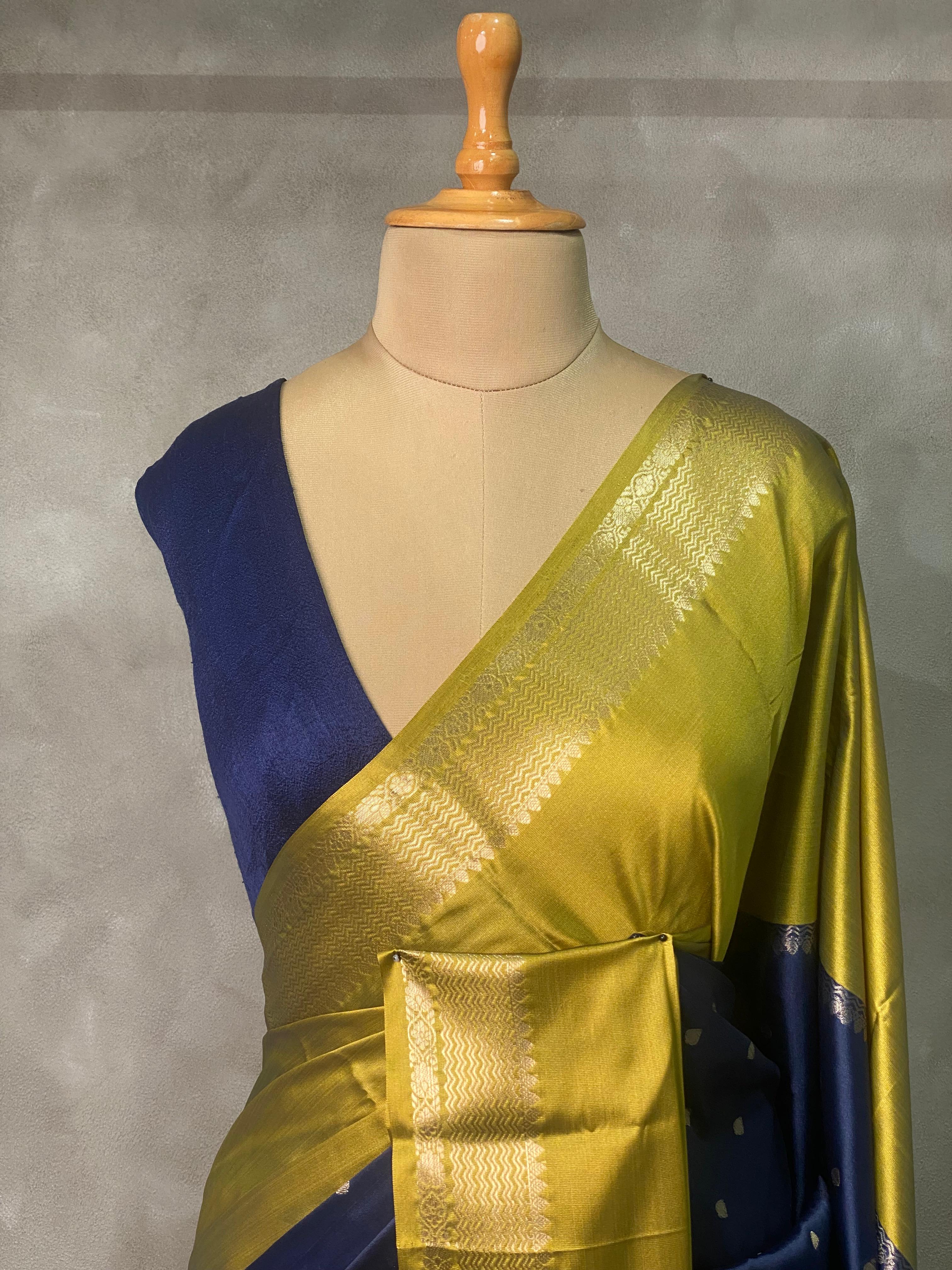 Semi Gajji silk saree featuring a unique colour-block pattern with olive green on the upper and lower half, highlighted by a striking mid-blue panel. The soft, flowy fabric drapes beautifully, creating an elegant and contemporary look. A gorgeous combination that blends modern style with effortless grace.