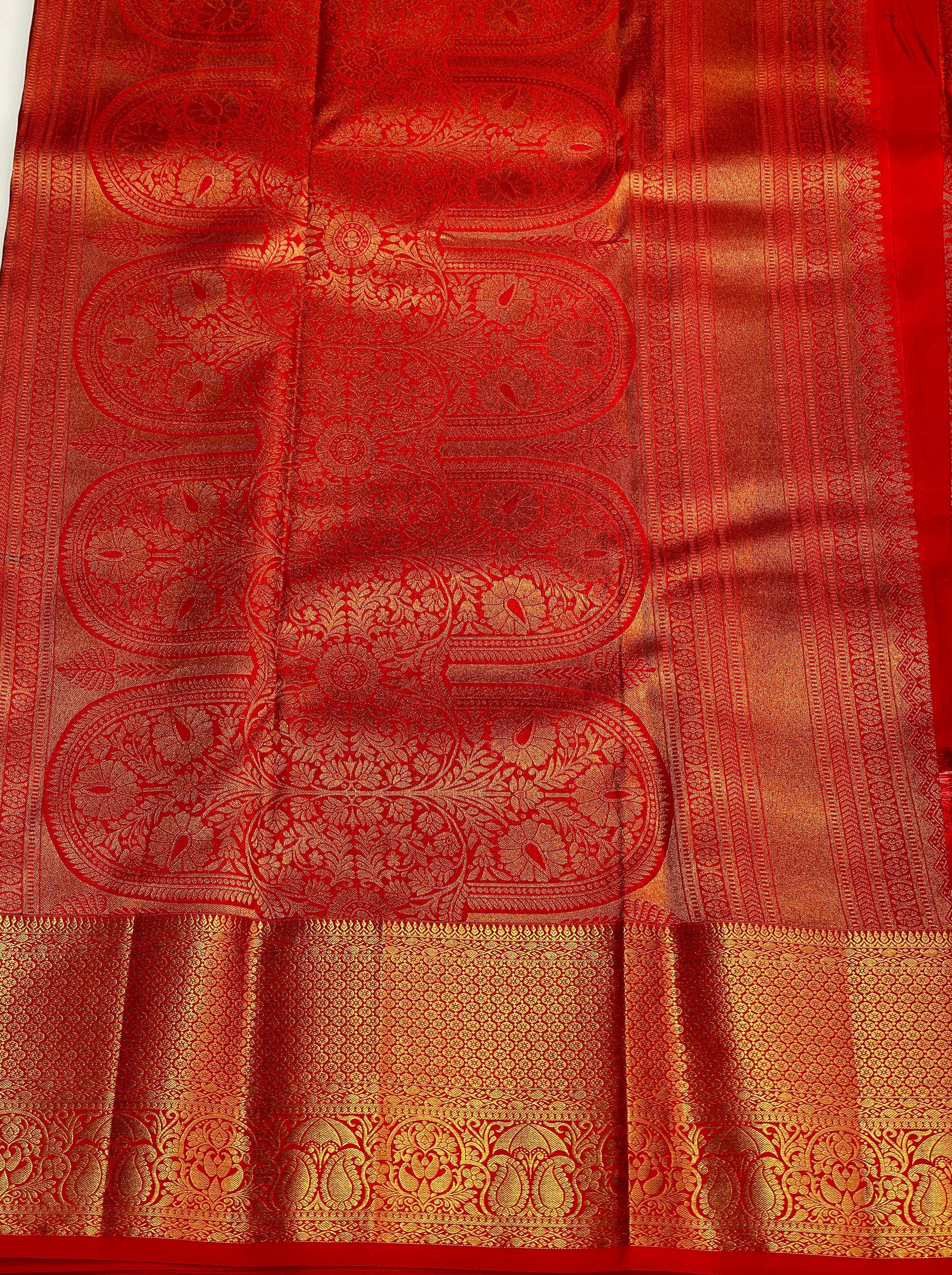 Stunning Bridal kanchipuram semi silk saree in an all over brocade weaving pattern, adorned with rich golden zari, perfect for graceful traditional look