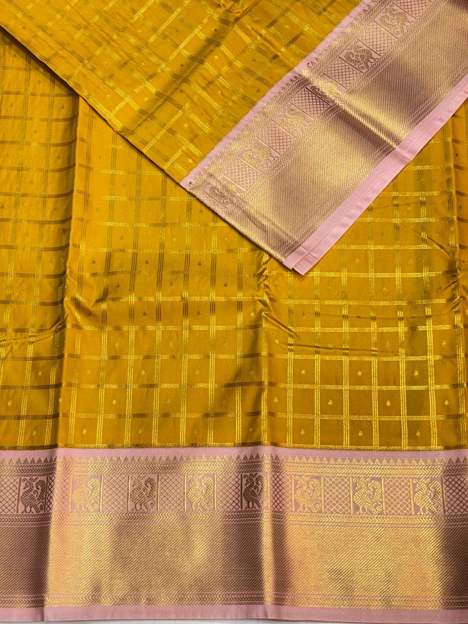 Soft Semi Kanchipuram saree featuring all-over zari motifs, complemented by a traditional border and rich pallu — a graceful blend of classic design and timeless elegance.