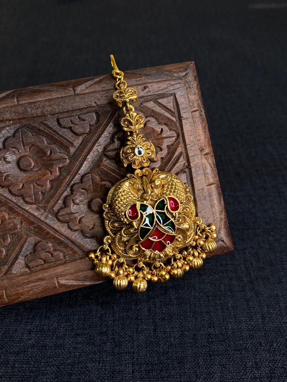 Antique maang tikka featuring intricate traditional craftsmanship and elegant detailing — a timeless accessory that adds royal charm to any bridal or festive look add a description