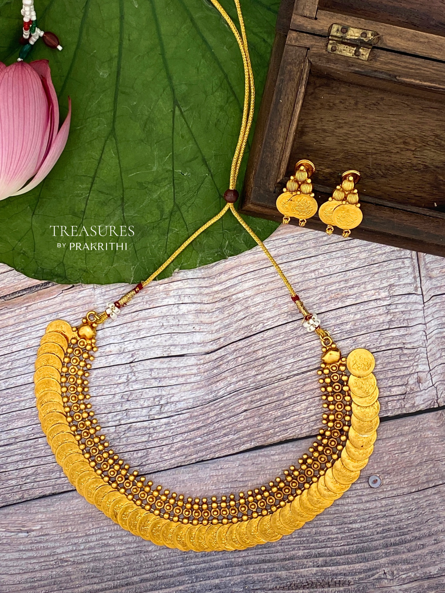 Traditional coin necklace paired with matching stud earrings, featuring intricate motifs and timeless antique detailing — a perfect blend of heritage and elegance.