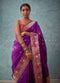 Stunning pure Kanchipuram saree features a unique yellowish olive green and purple combination, enriched with pure 2G antique zari for a rich and timeless elegance.