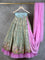 Elegant lehenga set features a flared panel-cut tissue skirt, finished with soft pink net at the hem. It is paired with a pastel blue raw silk blouse and a light pink chiffon dupatta. The soft pastels and luxurious fabrics make it ideal for festive occasions or weddings.