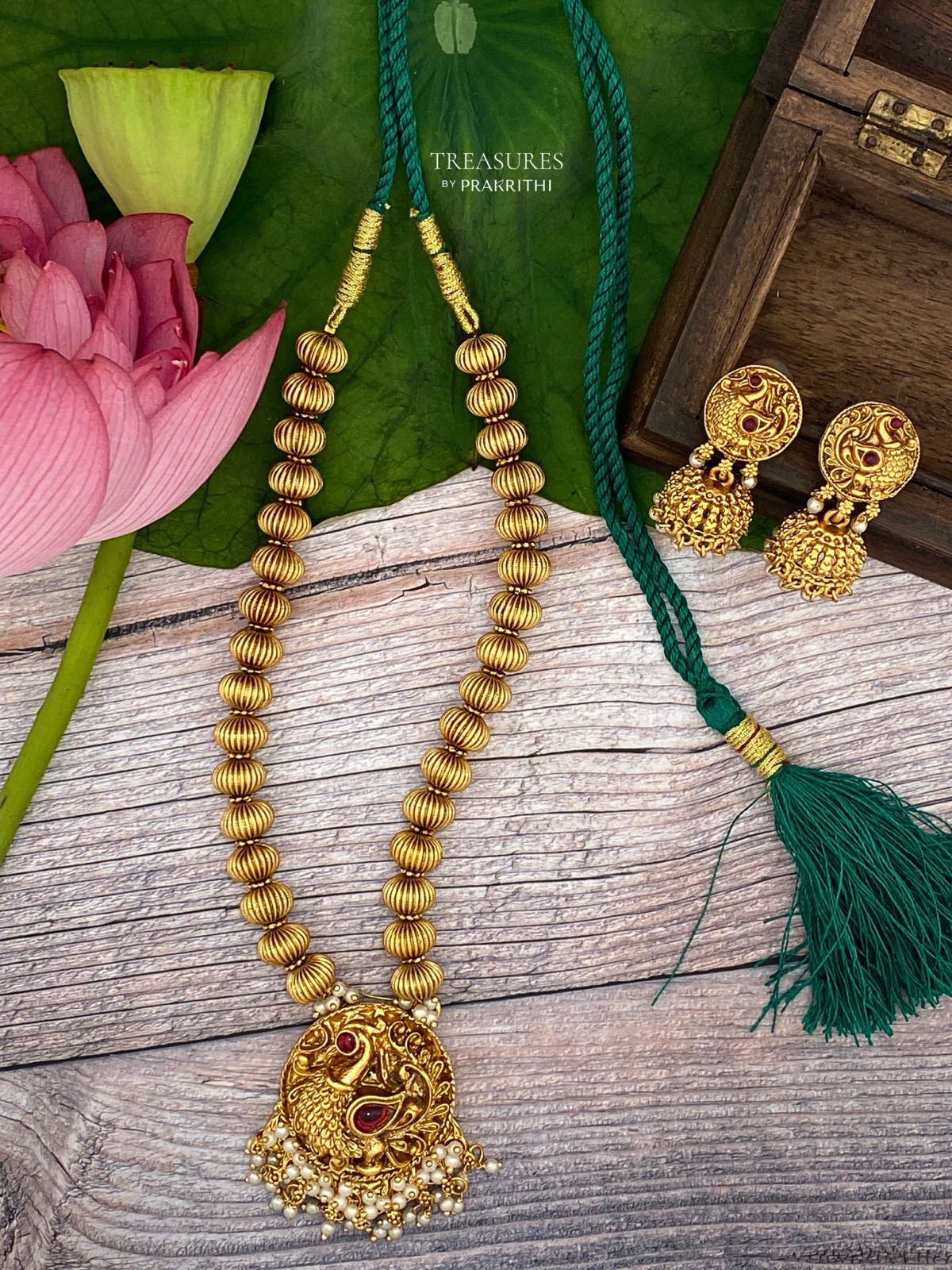 Antique gold long haaram with a peacock motif pendant, detailed with pearls and matching jhumkas.