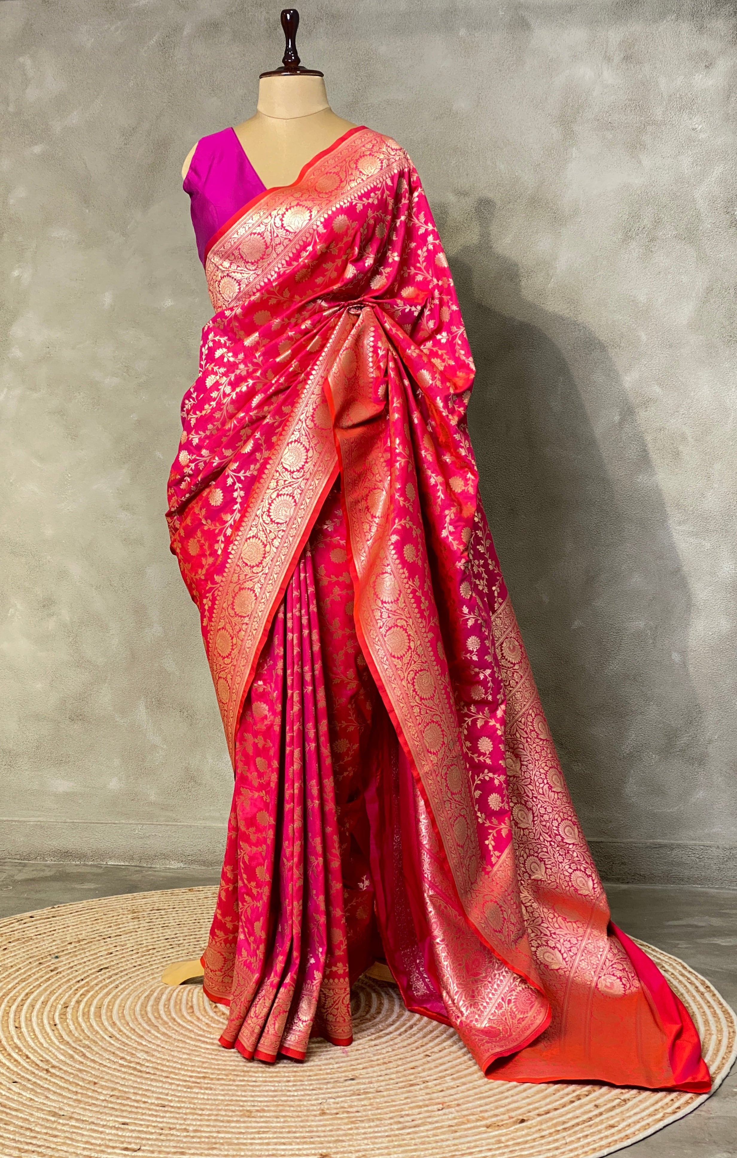 Gracefully woven in luxurious silk, this reddish rani pink shade Banarasi saree features intricate light golden zari work and timeless motifs. Its rich color and classic design make it a stunning choice for weddings, festivals, and special occasions.