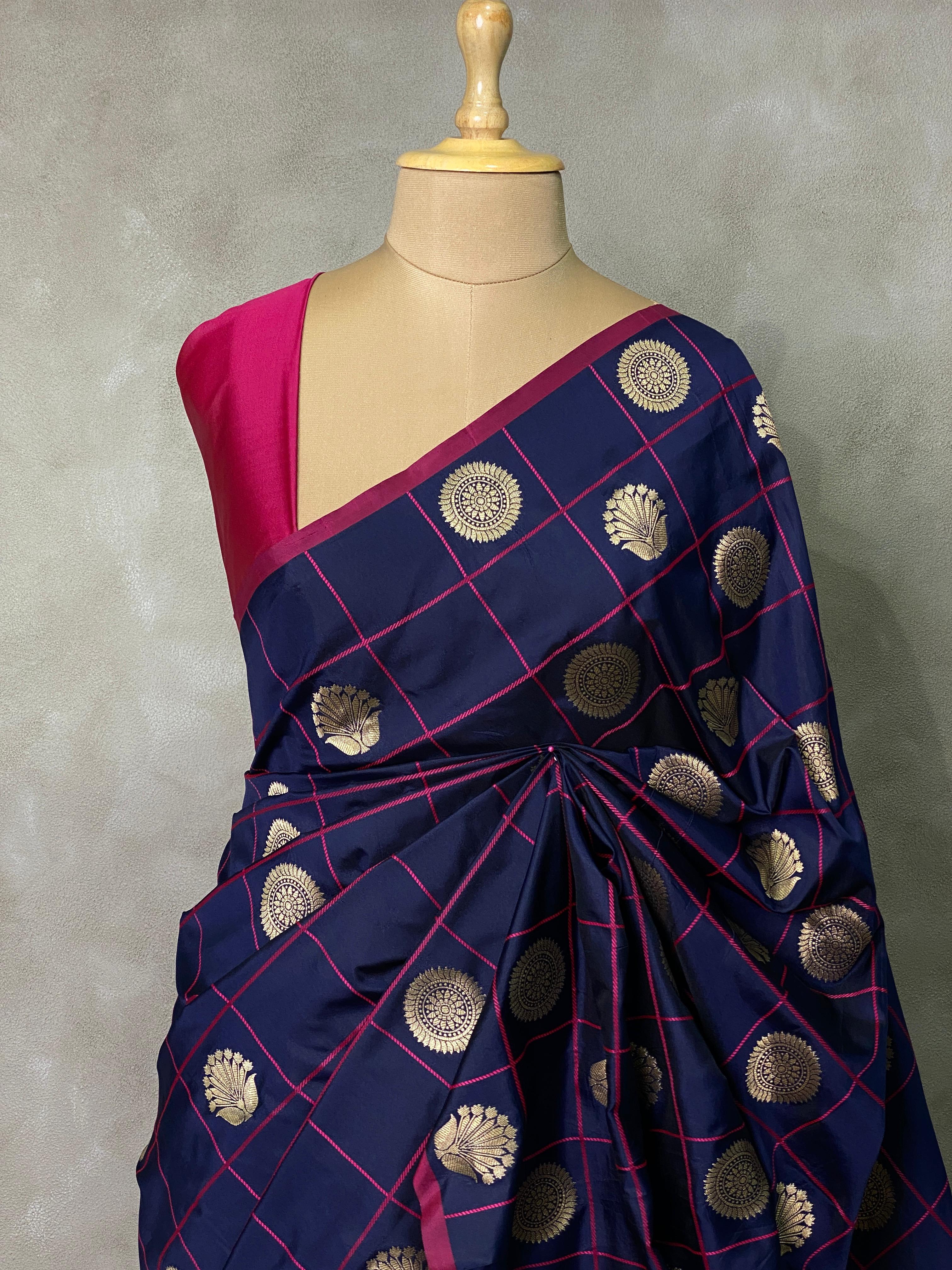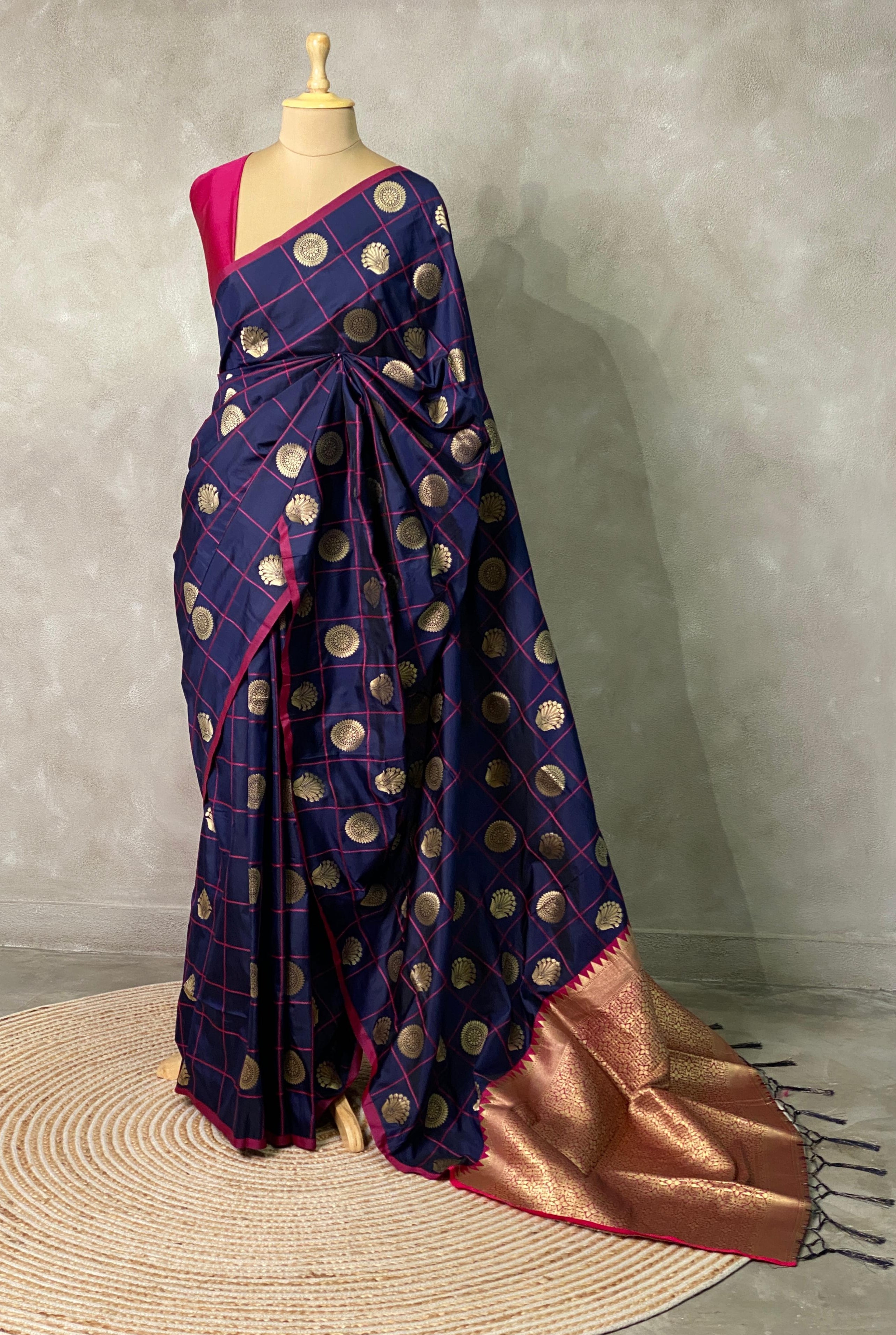 Semi Kanchipuram soft silk saree with traditional border. The main body of the saree is a blue color, adorned with all over check pattern and small golden motifs and contrasting highlight border and pallu.