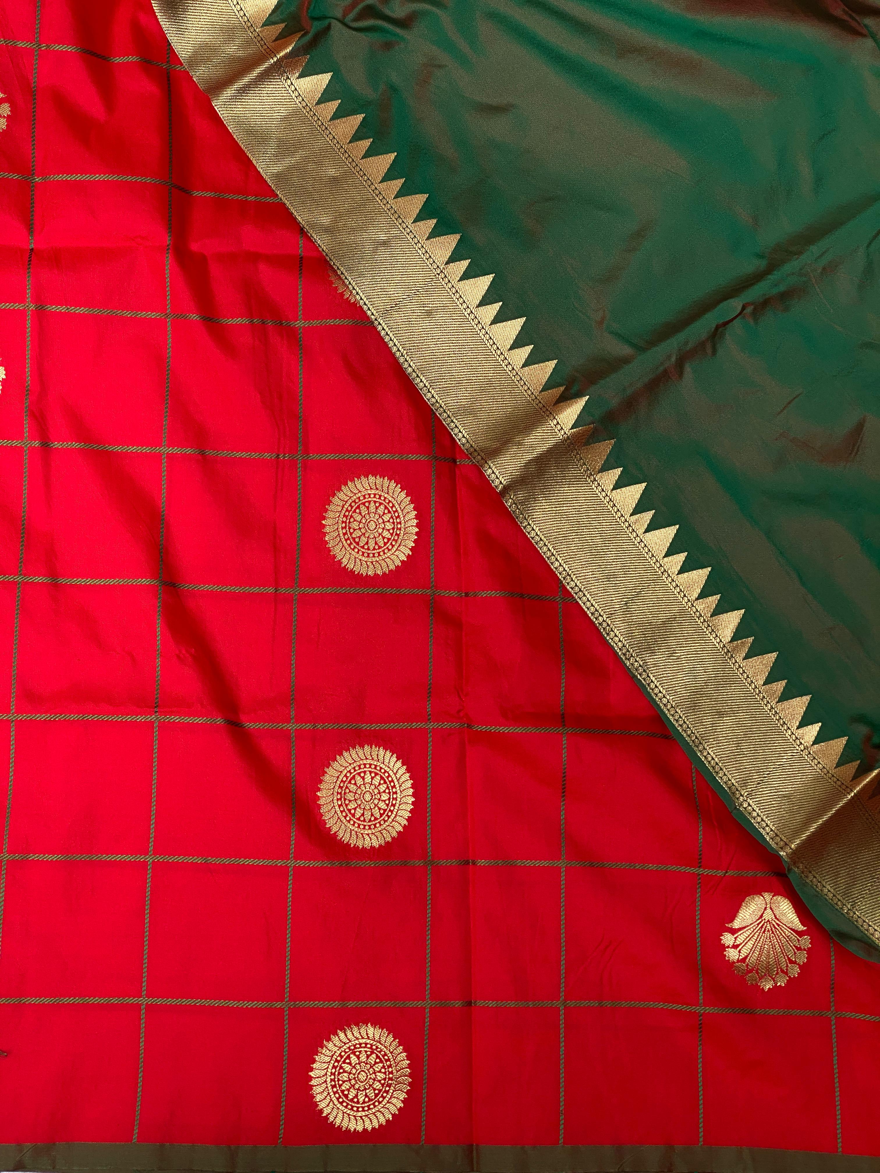 Semi Kanchipuram soft silk saree with traditional border. The main body of the saree is a red color, adorned with all over check pattern and small golden motifs and contrasting highlight border and pallu.
