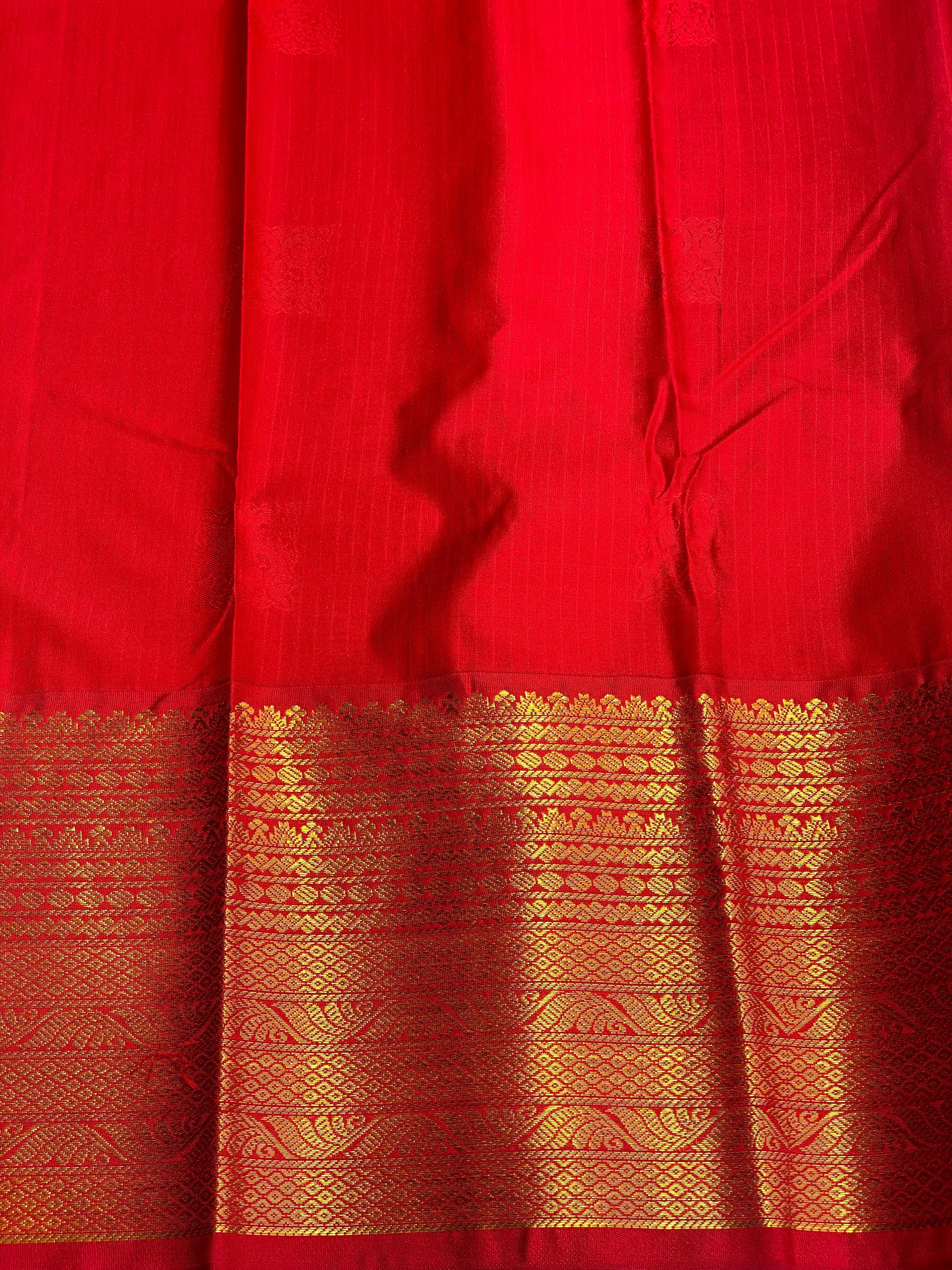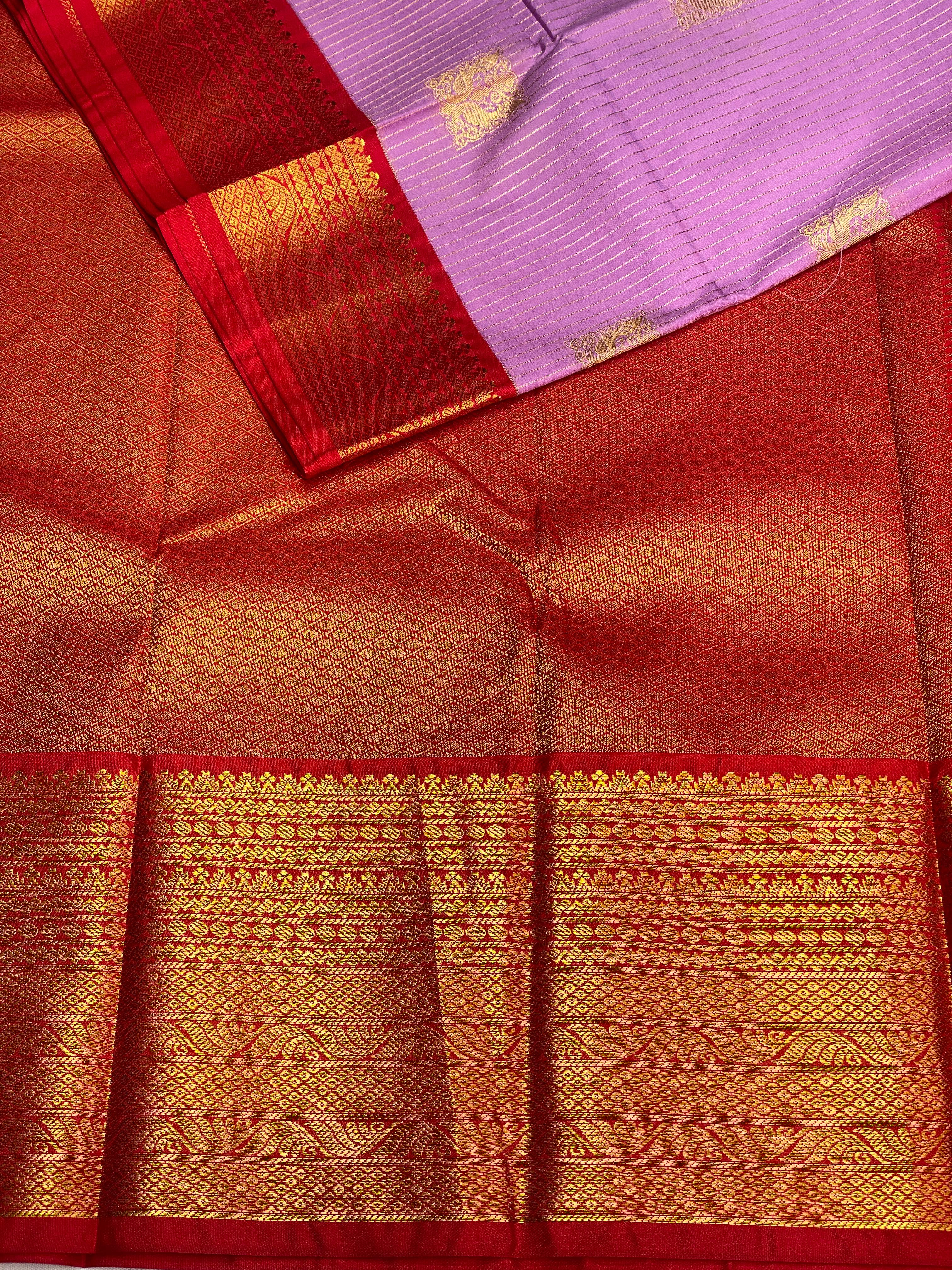 Traditional kanchipuram style soft silk saree featuring all over zari buttas,rich kanchi border , and a contrasting blouse piece