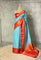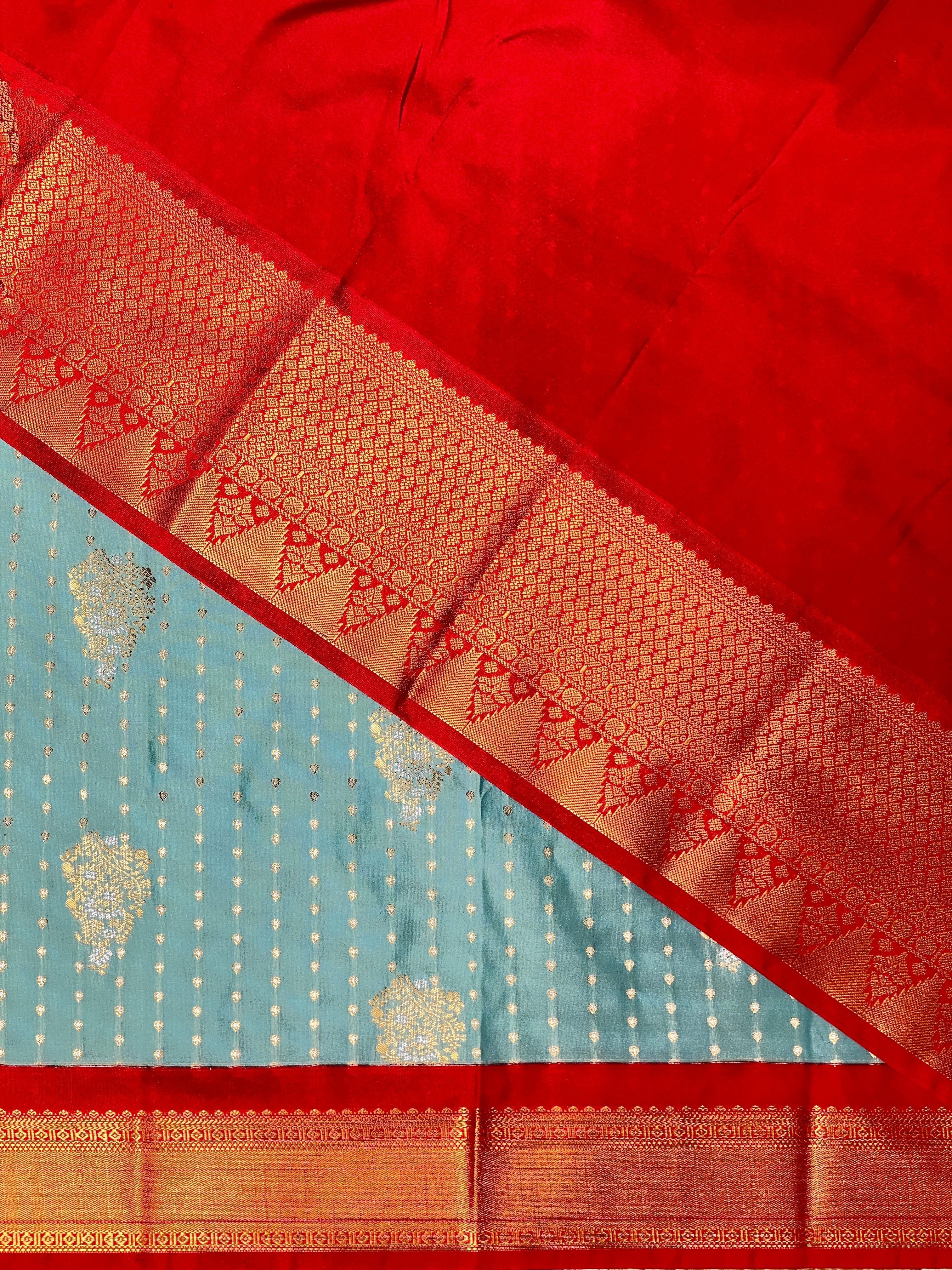Light blue semi kanchi saree with red contrast blouse and pallu, adorned with all over lines and motifs. A rich and graceful choice for valakapp, wedding functions, and festive celebrations.