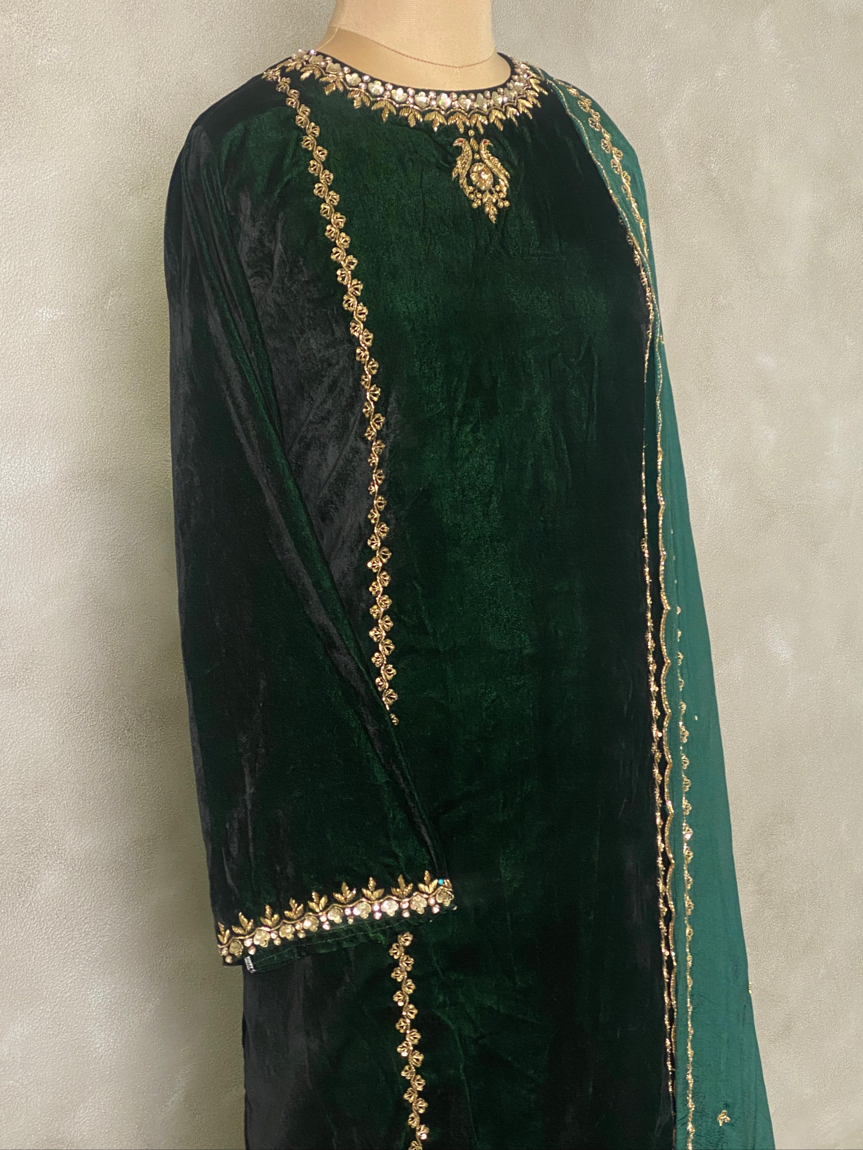 Premium velvet salwar set features a dark green top and bottom with golden embroidery, paired with a matching chiffon dupatta. Perfect for weddings or festivals, it offers a rich and elegant look.
