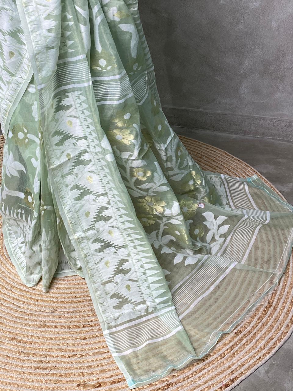 Elegant cotton saree featuring all-over Jamdani weaving in beautiful shades. Soft, artistic, and perfect for effortless everyday elegance