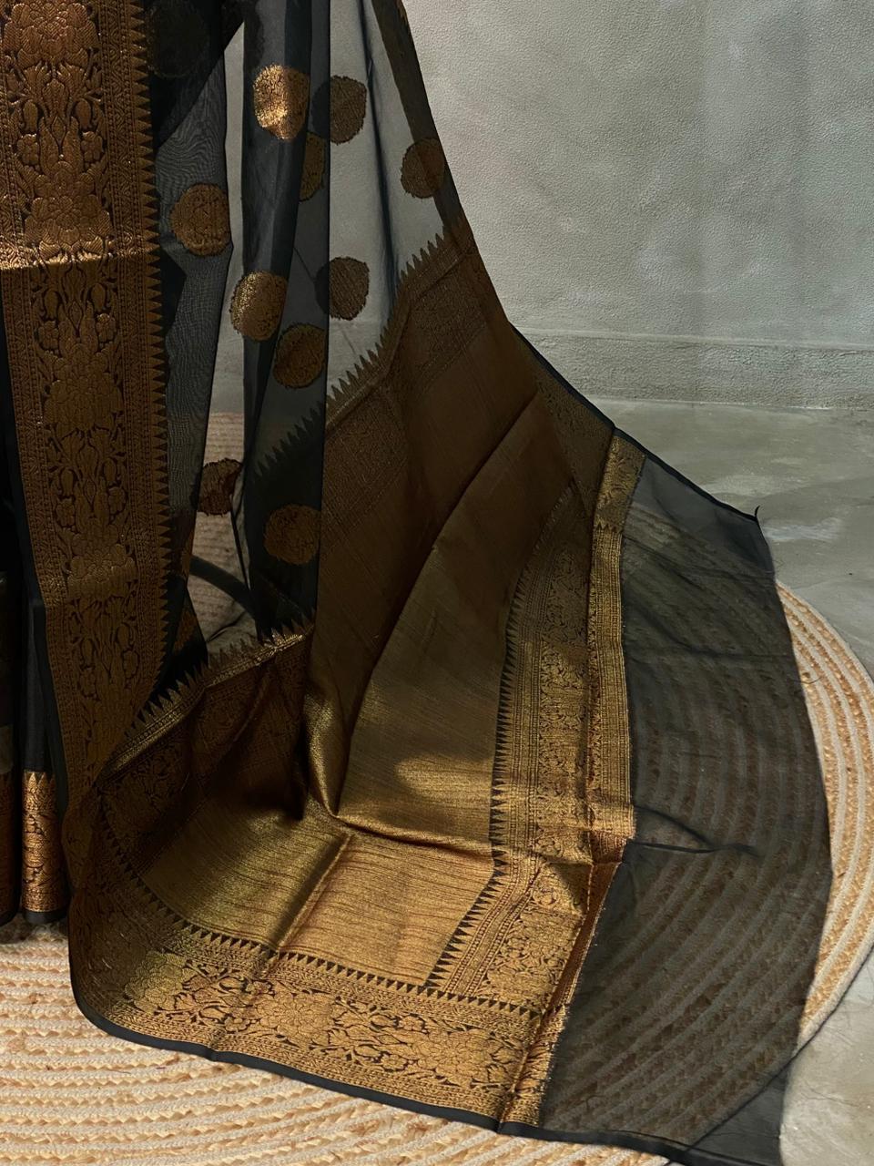 Banarasi georgette saree in an attractive colour, lightweight and easy to drape. The body is adorned with all-over zari buttas, beautifully complemented by a rich copper zari woven border and pallu — a perfect blend of elegance and festive charm