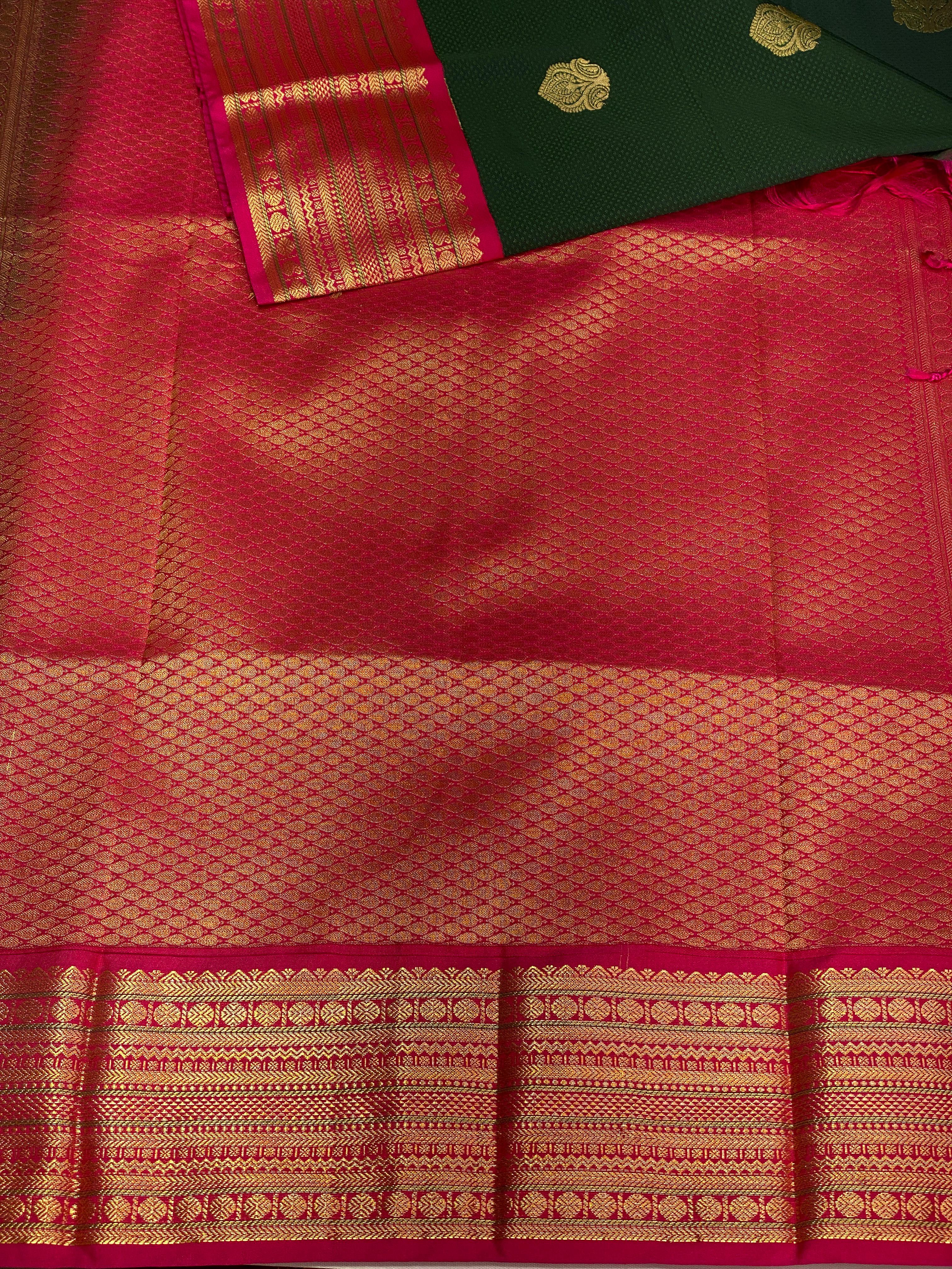soft silk Kanchipuram saree with all-over small buttas, paired with a contrast blouse and pallu.