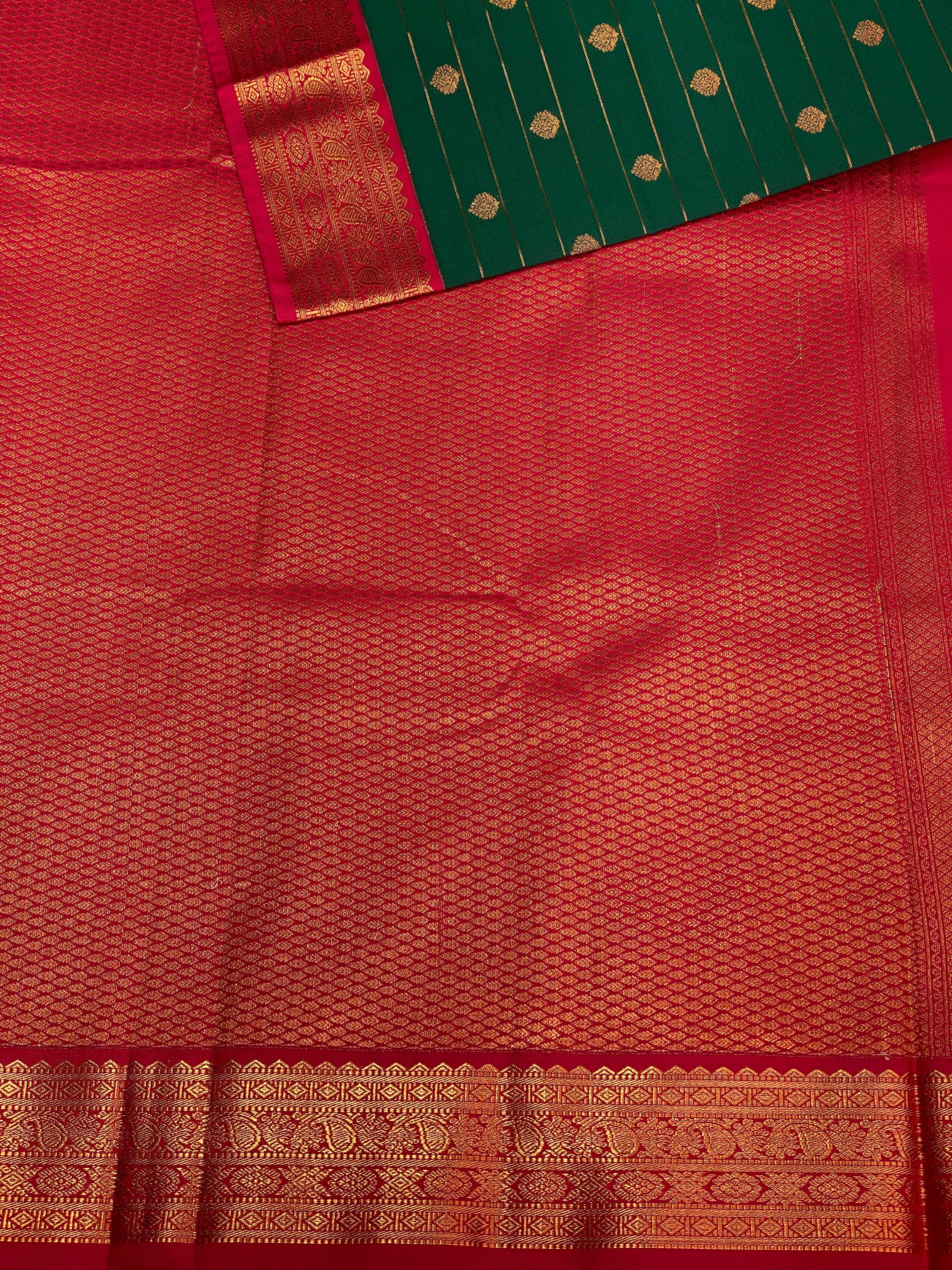soft silk Kanchipuram saree with all-over buttas, paired with a contrast blouse and pallu.