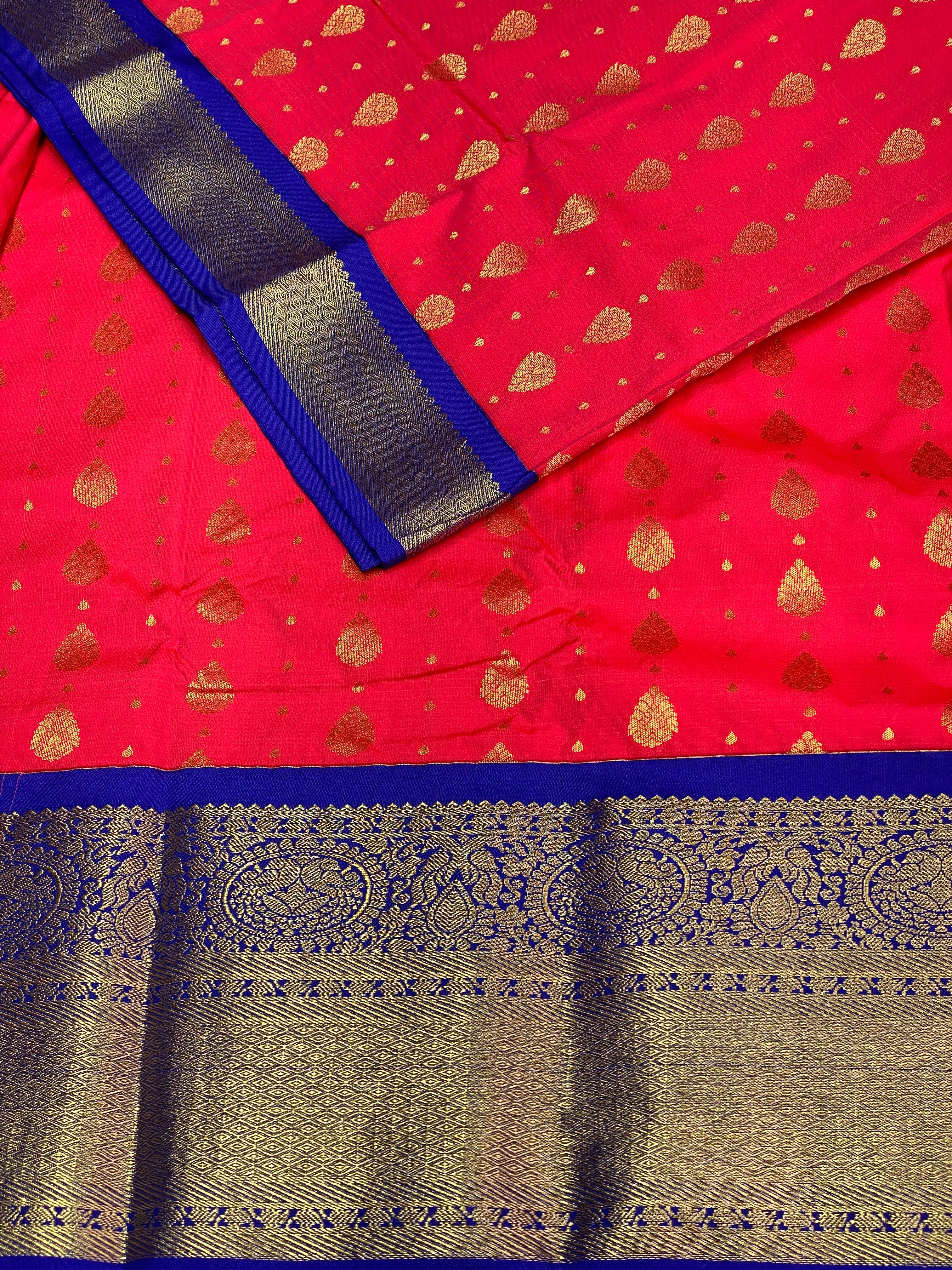 soft silk Kanchipuram saree with all-over buttas, paired with a contrast blouse and pallu.