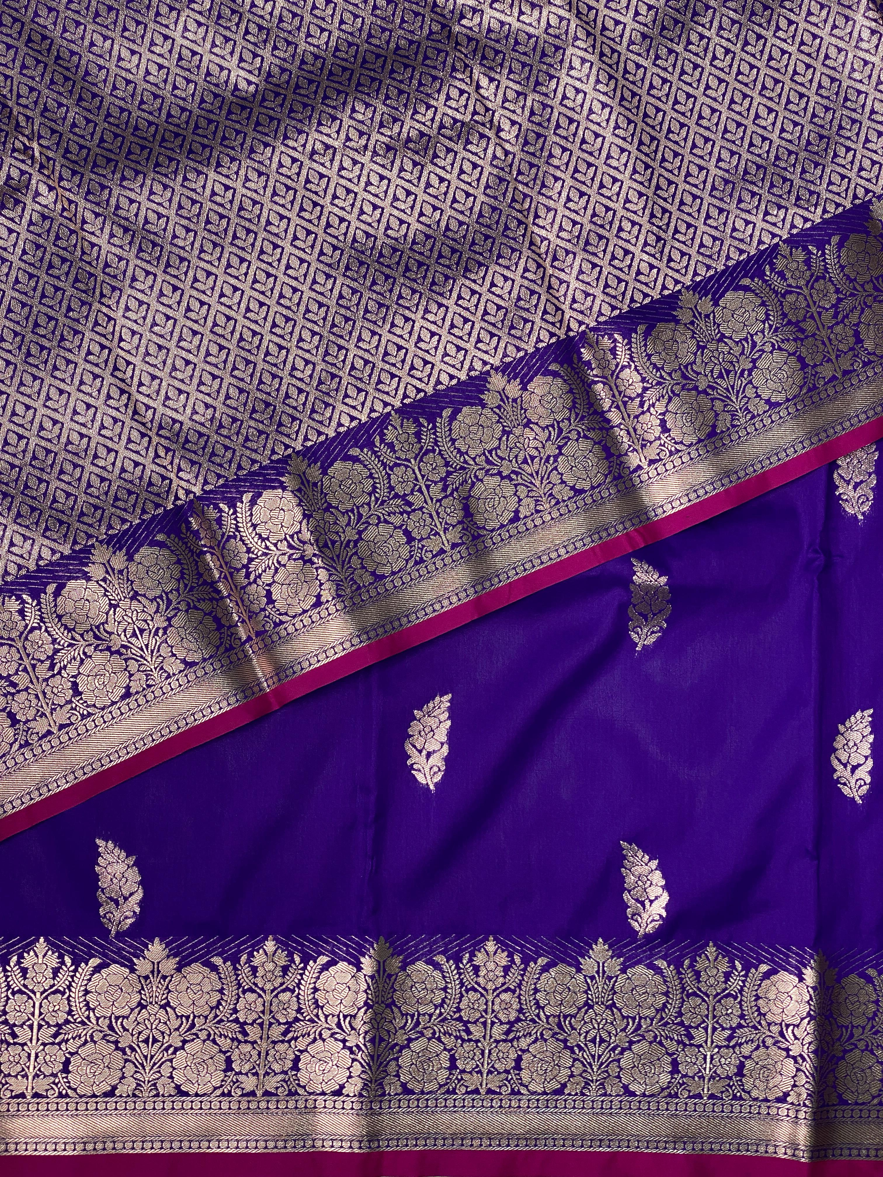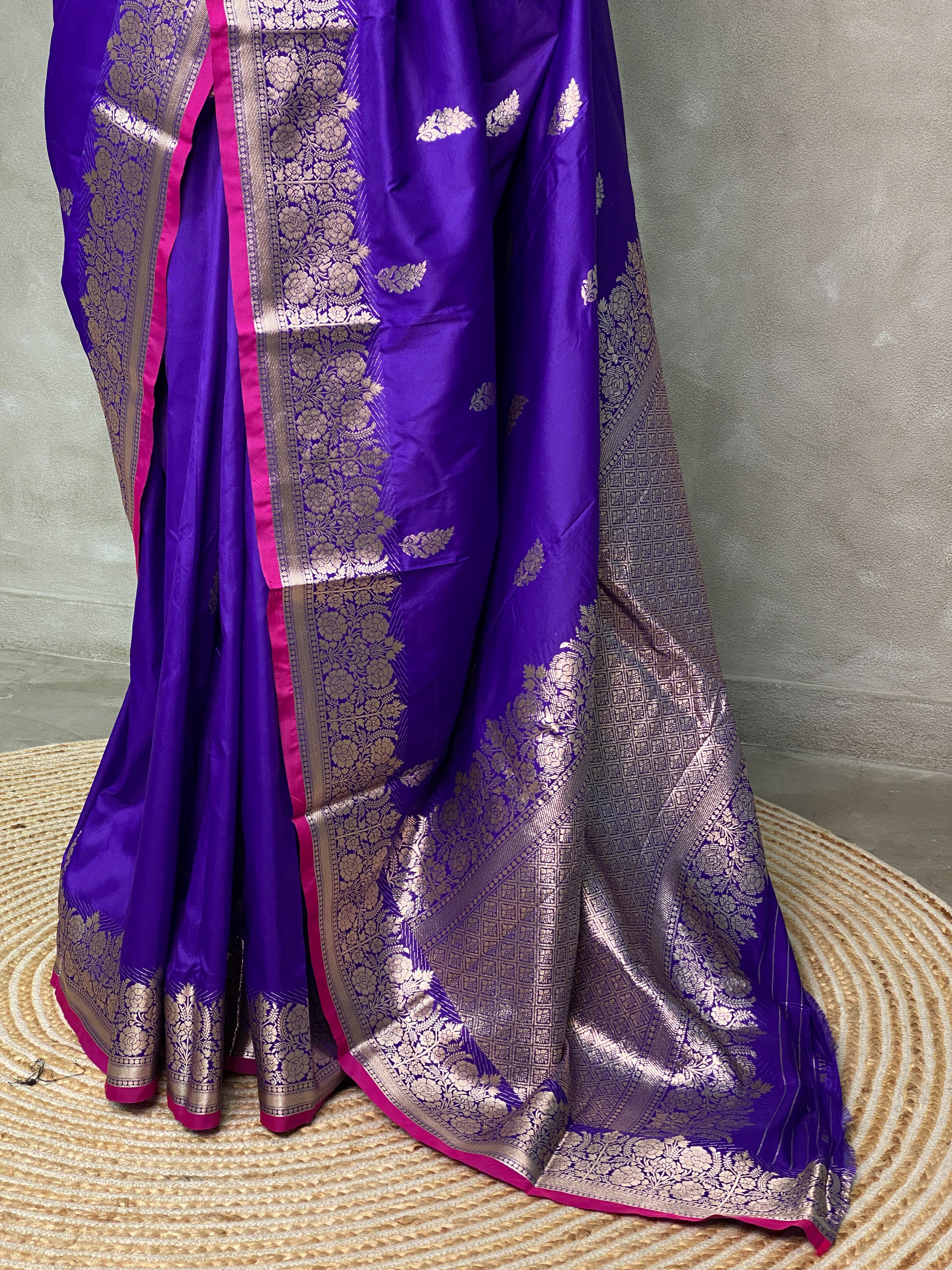 Elegant semi-Banarasi saree with the look and feel of pure Banarasi, beautifully lightweight and easy to drape. Adorned with delicate light gold zari weaving, a rich border and pallu, and paired with a brocade blouse — perfect for festive elegance
