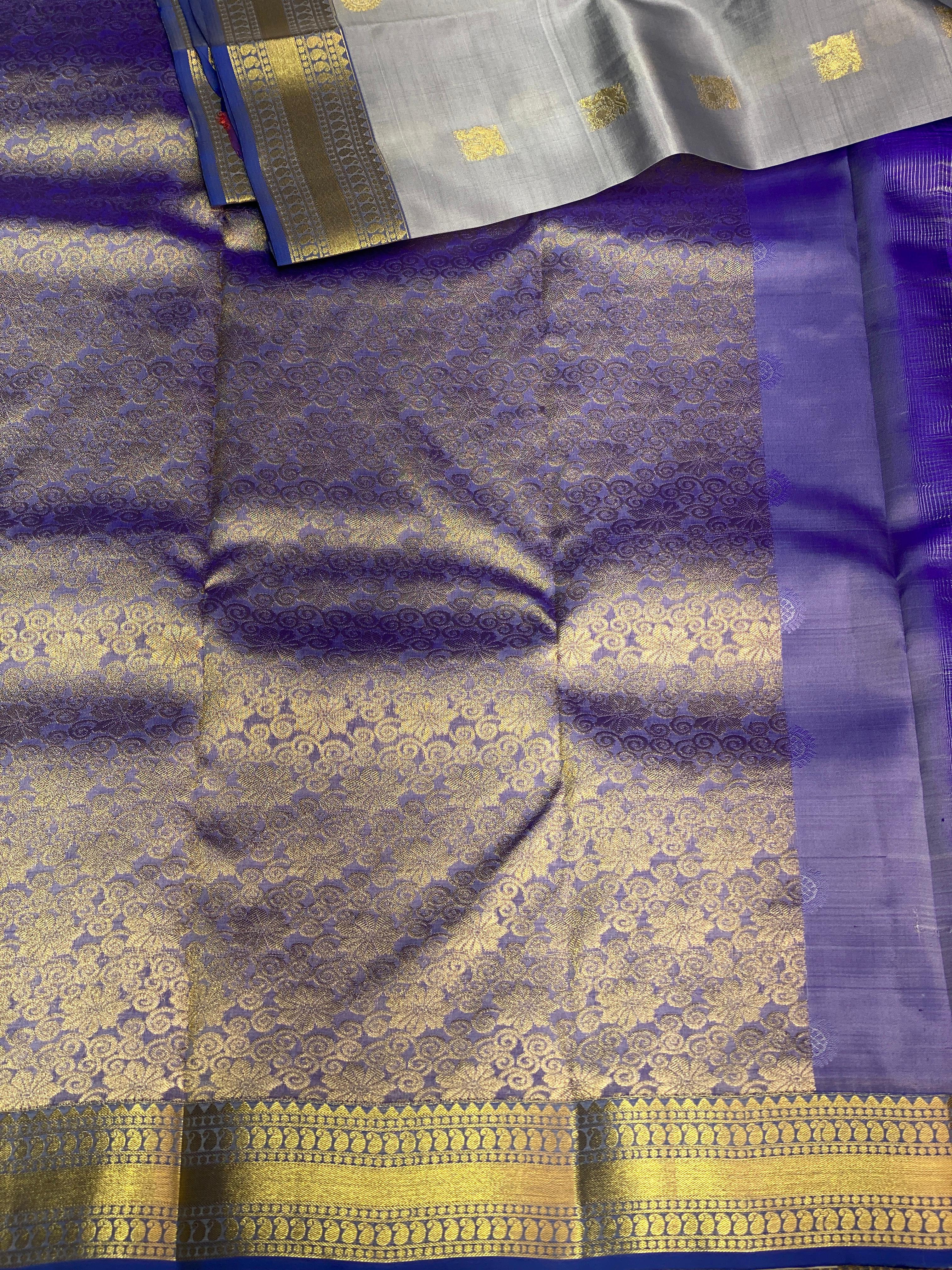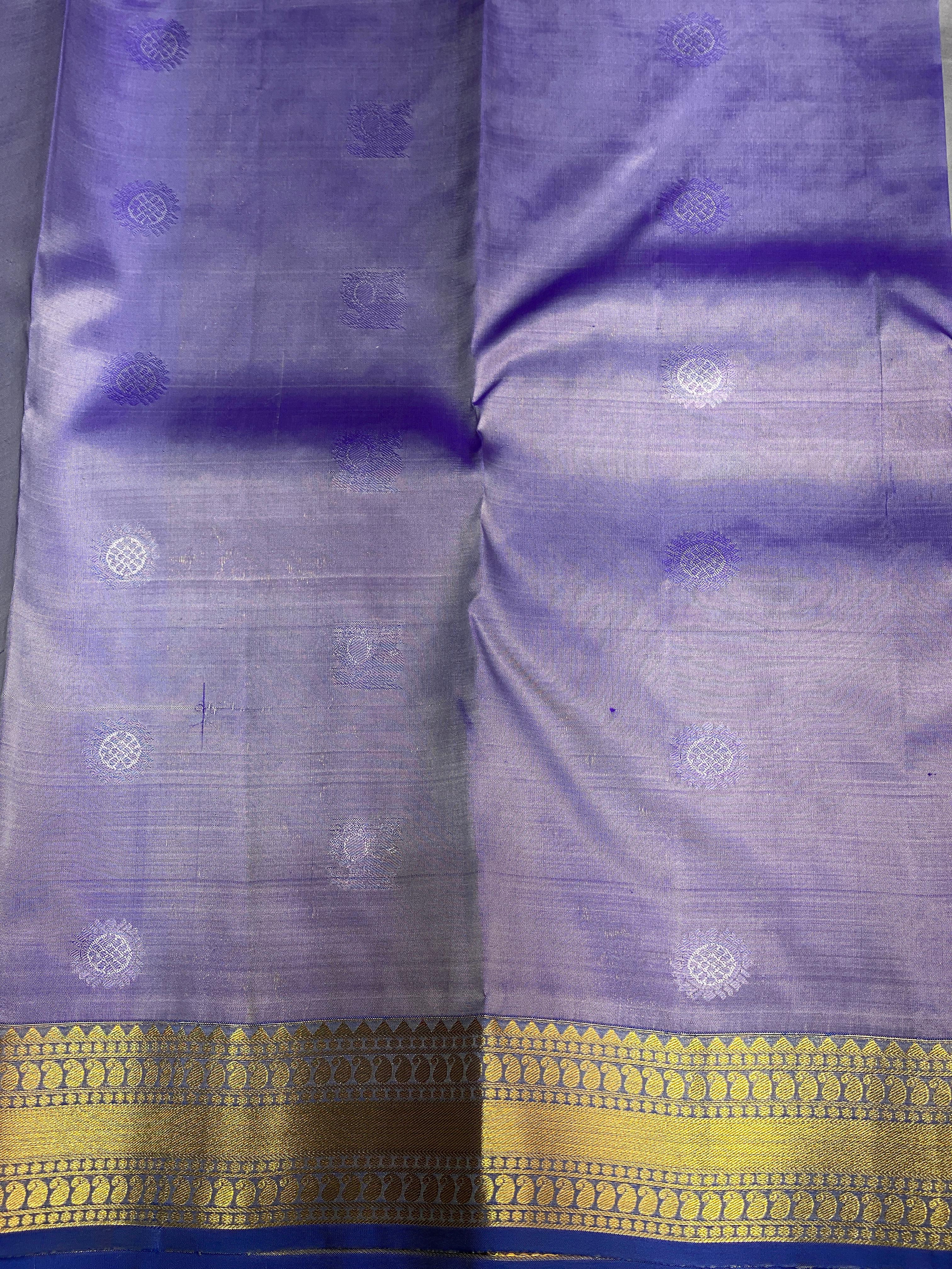 Pure organza Kanchipuram silk saree adorned with all-over zari motifs, complemented by  beautifully woven border and pallu — a timeless drape of tradition and grandeur